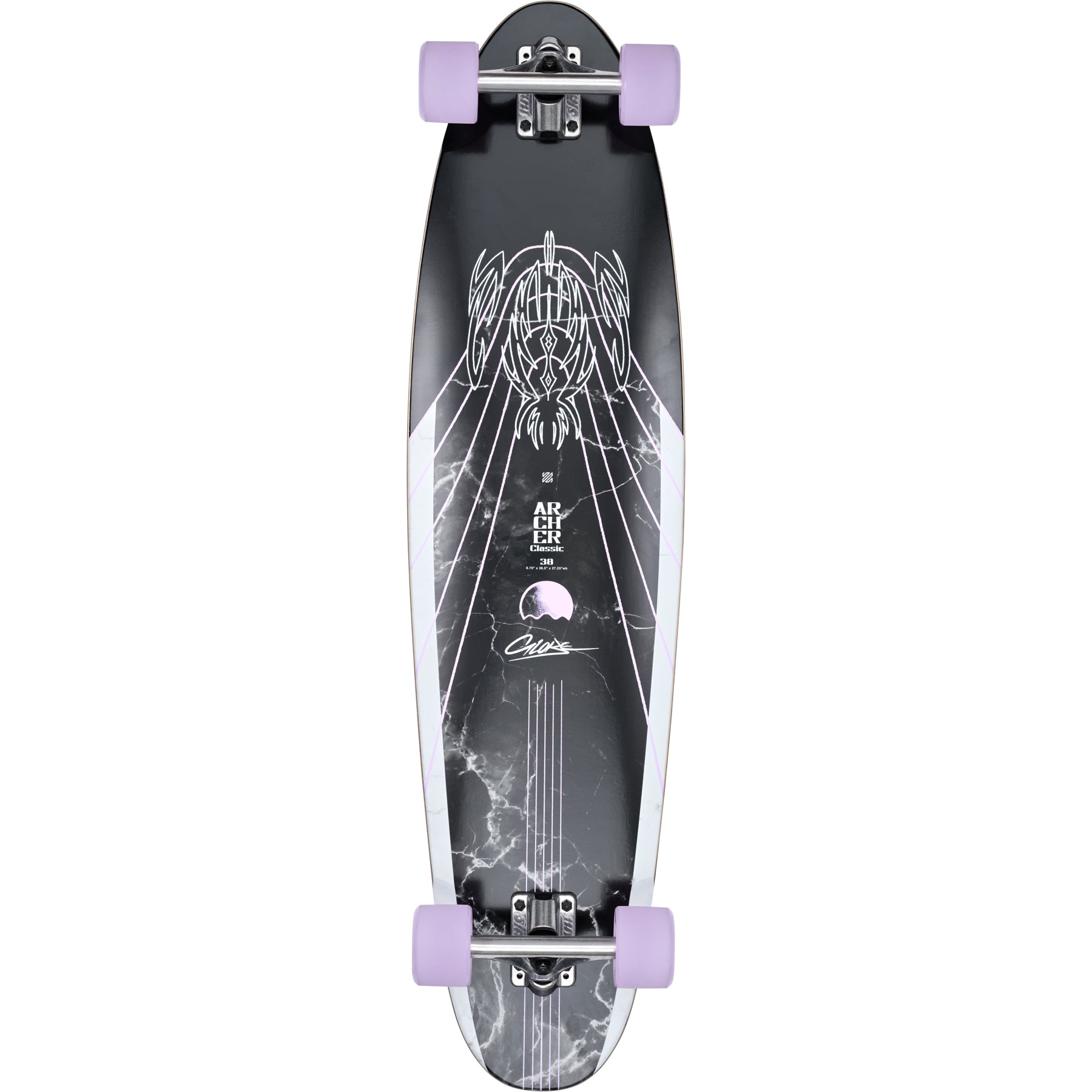 Rocking a long symmetrical deck, angled risers and responsive trucks, perfect for lazy mellow rides and carvy turns!